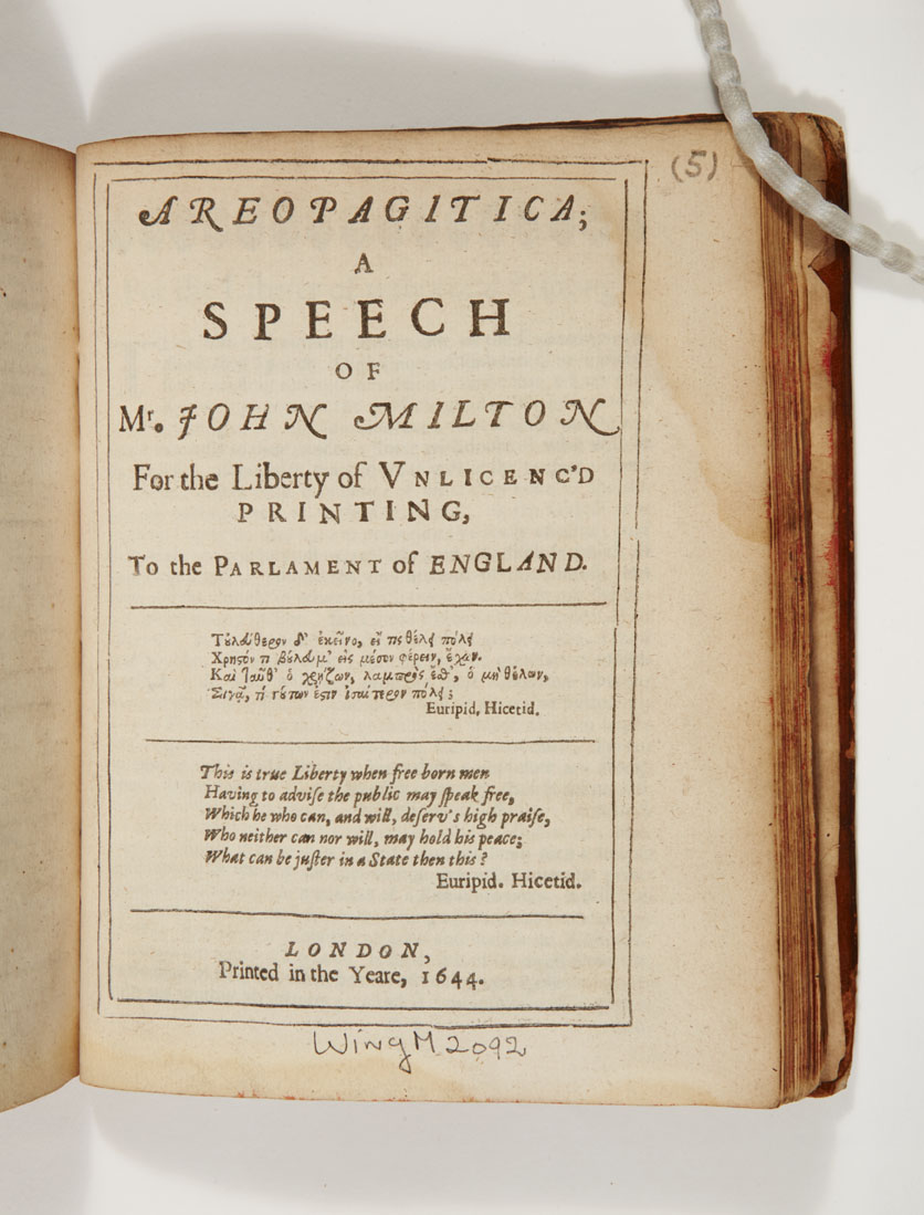 – A volume of John Milton treatises dating from 1644, which includes copies of his famed works such as ‘Of Education’, ‘The Doctrine and Discipline of Divorce’, and the Areopagitica – one of the earliest defences of the right to a free press.