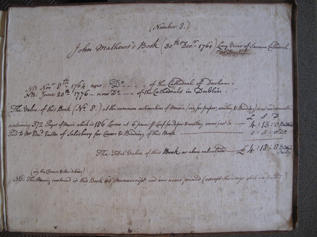 Sue Hemmens described four score books copied by Matthews now held in Marsh’s Library, which travelled with him to successive posts in Winchester, Salisbury, Durham and, finally, Dublin. One of these is a score of Handel’s Messiah, which has been studied in detail for its record of variant performance practices. Matthews was meticulous about keeping accounts: payment details from the scores show the costs of copying and of binding the works (as in the image from the Messiah score shown here), and name the binders employed.