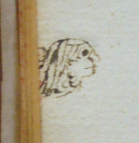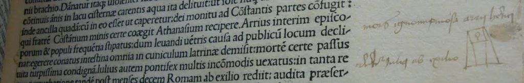 Most of these readers’ responses are written, but occasionally they are visual or graphical. This long-haired figure in a history of the Popes illustrates an episode in which Pope Anicetus reportedly decreed that no priest should wear his hair long. A few pages later, the annotator has drawn a latrine, illustrating the location in which, according to the text, Arius (who gave his name to the heretical doctrine of Arianism) came to a very messy end!