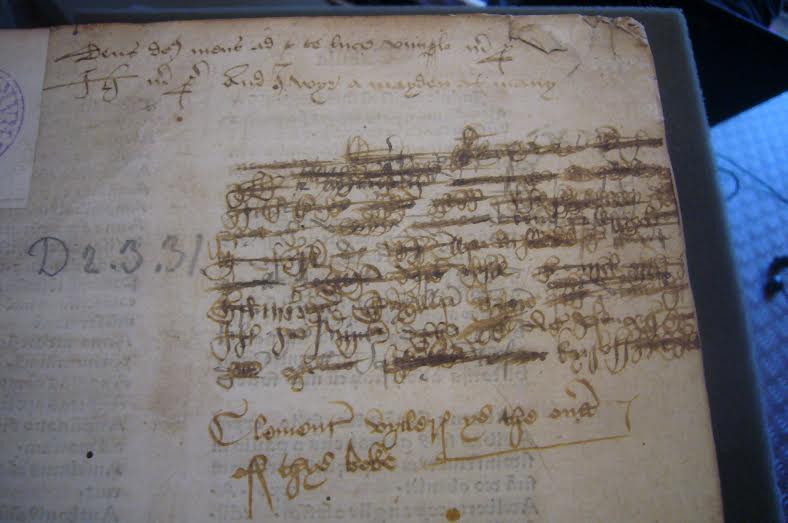 In some books there remains a catch of a song, or of a religious prayer or invocation, also seemingly unrelated to the text. In the following example, on an endpaper of Jacob of Voragine’s Legenda Aurea (Cologne, 1483), we find both. An early owner, Clement Vyllers, has claimed ownership in a hand typical of the late fifteenth century. He has also written the opening words in Latin of Psalm 62[63]: “Deus Deus meus ad te de luce vigilo”. He commingles the profane as well as the sacred, though, when on the next line he copies the beginning of a sixteenth-century English song lyric about a young girl seduced at court: